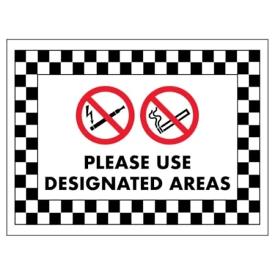 V Safety No Smoking or Vaping, Please Use Designated Areas 200 x 150 mm 3mm Brushed Aluminium Composite Sign