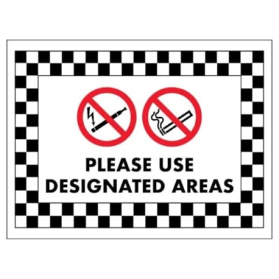 V Safety No Smoking or Vaping, Please Use Designated Areas 300 x 200 mm 2mm Super Tough Rigid Plastic Sign