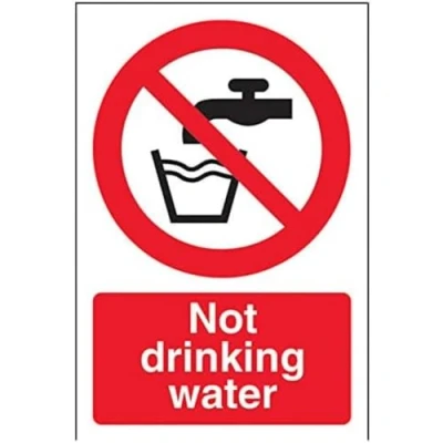 Clearly displays prohibited and potentially dangerous actions which employees and visitors must avoid in the interests of health and safety as per Health and Safety (Safety Signs & Signals) Regulations 1996 Conforms to EN ISO 7010:2012 - Prohibition signs feature a red circular symbol of at least 35% of the total sign area, on a white background, with a black pictogram Portrait Orientation. Sign reads "Not Drinking Water" Highly durable Self Adhesive Vinyl material and screen printed message will stand the test of time Sign measures 100 x 150mm. Self Adhesive material will adhere securely to most surfaces