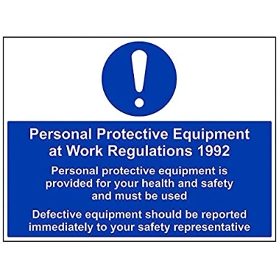 Helps to fulfil legal obligations to remind staff and visitors to wear the appropriate PPE when required to ensure personal safety as per Health and Safety (Safety Signs & Signals) Regulations 1996 Conforms to EN ISO 7010:2012 - Mandatory Signs feature a round symbol with a blue background of at least 50% of the total sign area, with a white pictogram and text Landscape Orientation. Sign reads "Personal Protective Equipment At Work Regulations 1992. Personal Protective Equipment Is Provided For Your Health And Safety And Must Be Used" Screen printed on high quality 2mm rigid plastic material Sign measures 600 x 450mm