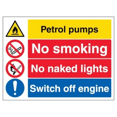 V Safety Petroleum Pumps/No Smoking/Switch Off 400 x 300 mm Glow In The Dark 1mm Rigid Plastic Sign