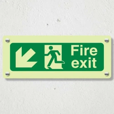 Wording & Purpose - Sign reads "Fire Exit Arrow Down Left"; designed to mark escape routes and exit doors for safe evacuation. Material & Build - durable self-adhesive vinyl for fast, drill-free installation and a secure bond on smooth, non-porous surfaces; photoluminescent surface that charges under ambient light and provides clear guidance during power loss. Visibility & Legibility – Photoluminescent surface charges under ambient light and glows in darkness or power loss to maintain guidance when lighting fails. Compliance by Design – Manufactured to follow UK/EU safety-sign rules, using the correct EN ISO 7010 pictograms, shapes and colour coding, with layouts aligned to HSE Safety Signs & Signals Regulations (1996) and BS 5499 legibility principles for clear, consistent communication. Made in Britain – Manufactured in Britain using premium materials for dependable quality, durable finishes and fast turnaround; engineered for high‑traffic commercial settings.