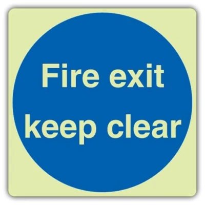 Wording & Purpose - Sign reads "Fire Exit Keep Clear - Square"; designed to mark escape routes and exit doors for safe evacuation and prevent blockages around critical routes or equipment. Material & Build - durable self-adhesive vinyl for fast, drill-free installation and a secure bond on smooth, non-porous surfaces; photoluminescent surface that charges under ambient light and provides clear guidance during power loss. Visibility & Legibility – Photoluminescent surface charges under ambient light and glows in darkness or power loss to maintain guidance when lighting fails. Compliance by Design – Manufactured to follow UK/EU safety-sign rules, using the correct EN ISO 7010 pictograms, shapes and colour coding, with layouts aligned to HSE Safety Signs & Signals Regulations (1996) and BS 5499 legibility principles for clear, consistent communication. Made in Britain – Manufactured in Britain using premium materials for dependable quality, durable finishes and fast turnaround; engineered for high‑traffic commercial settings.