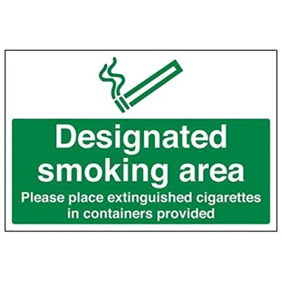 Clearly establishes areas where smoking is prohibited to employees and visitors. Complies with the Smoke-free (Signs) Regulations 2007 Conforms to EN ISO 7010:2012 - Prohibition signs feature a red circular symbol of at least 35% of the total sign area, on a white background, with a black pictogram Landscape Orientation. Sign reads "Designated Smoking Area. Please Place Extinguished Cigarettes In Containers Provided" Highly durable and heavy duty 2mm rigid plastic material Sign measures 400 x 300mm