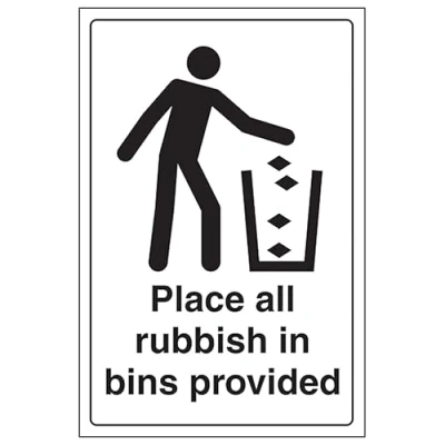 V Safety Place Rubbish In Bins Provided Portrait 200 x 300 mm 2mm Super Tough Rigid Plastic Sign