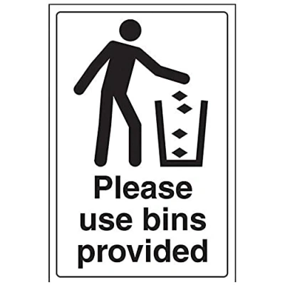 Portrait Orientation. Sign reads "Please Use Bins Provided" Highly durable 1mm plastic material and screen printed message will stand the test of time Sign measures 200 x 300mm 0 0