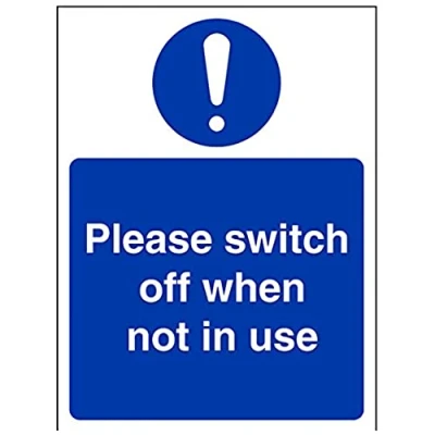 Helps to fulfil obligations to show vital escape route information about fire doors for all employees and visitors as per Health and Safety (Safety Signs & Signals) Regulations 1996 Conforms to EN ISO 7010:2012 Portrait Orientation. Sign reads "Switch Off When Not In Use" Highly durable Self Adhesive Vinyl material and screen printed message will stand the test of time Sign measures 150 x 200mm. Self Adhesive material will adhere securely to most surfaces