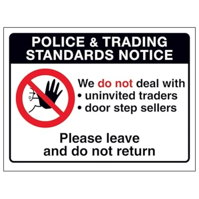 V Safety Police & Trading...We Do Not...Please Leave and Not Return 200 x 150 mm 2mm Rigid Plastic Sign