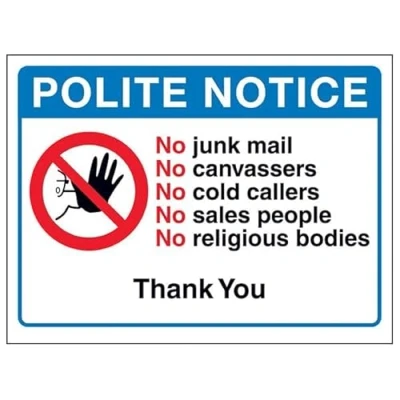 V Safety Polite Notice, No Junk Mail, Canvassers, Cold...Thank You 150 x 100 mm Self Adhesive Vinyl Aluminium Effect Sign