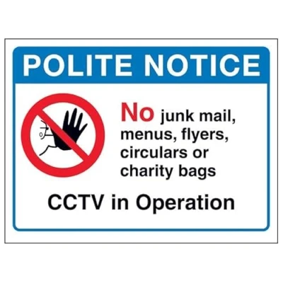 V Safety Polite Notice, No Junk Mail, Menus...CCTV in Operation 150 x 100 mm 1mm Rigid Plastic Sign