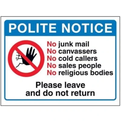 V Safety Polite Notice: No Junk Mail or Cold Callers Sign 200mm x 150mm Self Adhesive Vinyl