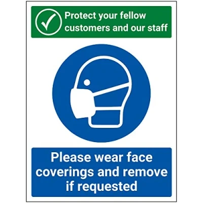 V Safety Protect Staff And Customers Remove Coverings Sign 200mm x 300mm Self Adhesive Vinyl
