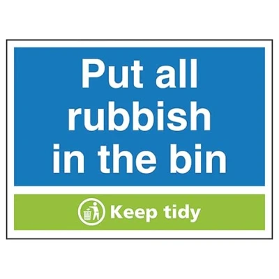 V Safety Put All Rubbish In the Bin Keep Tidy 400 x 300 mm 1mm Rigid Plastic Sign