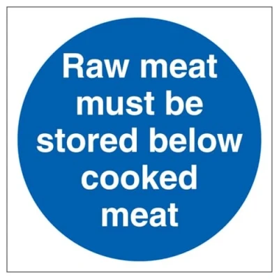 V Safety Raw Meat Must Be Stored Below Cooked 100 x mm 3mm Brushed Aluminium Composite Sign