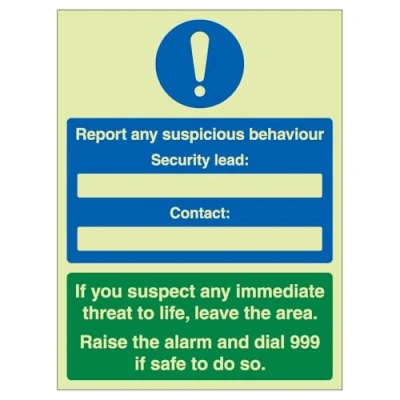 V Safety Report Any Suspicious Behaviour 300 x 400 mm Glow In The Dark 1mm Rigid Plastic Sign