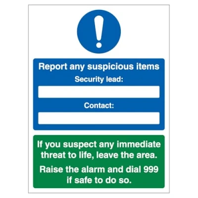 Easily identify your Security Lead to quickly report any suspicious items or activities. Reinforces your commitment to on-site safety, providing reassurance to staff, visitors, and customers. Includes a write-on space for adding the Security Lead’s details, ensuring easy access to important information. Features bold, high-quality print with durable UV-stabilized inks for a clear and lasting message. Available in a variety of sizes and materials, suitable for both indoor and outdoor environments.