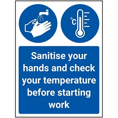 V Safety Sanitise Hands And Check Temp Before Work 150mm x 200mm Self Adhesive Vinyl