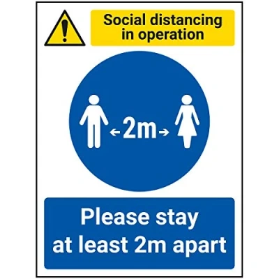 V Safety SD In Operation Stay 2m Apart 150mm x 200mm Self Adhesive Vinyl
