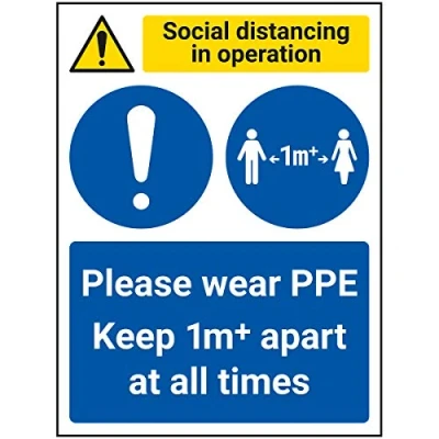 V Safety SD In Operation Wear PPE Keep 1M Apart 150mm X 200mm 1mm Rigid Plastic