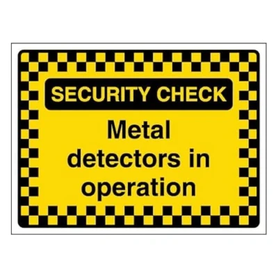 Bold design with a patterned border ensures the message is easily seen. Notifies visitors that metal detectors are actively in use for security screening. Made from robust, long-lasting materials suitable for indoor and outdoor environments. Can be securely positioned using adhesive or other appropriate mounting methods. Self Adhesive Vinyl - Easy to apply, durable, and suitable for indoor and outdoor use.