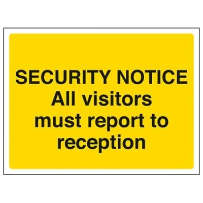 Helps to fulfil legal obligations to inform employees, visitors and the general public of potential hazards as per Health and Safety (Safety Signs & Signals) Regulations 1996 Conforms to EN ISO 7010:2012 - Warning signs feature a triangular symbol with a black pictogram and yellow background occupying at least 50% of the total sign area Landscape Orientation. Sign reads "Security Notice. All Visitors Must Report To Reception" Highly durable Self Adhesive Vinyl material and screen printed message will stand the test of time Sign measures 200 x 150mm. Self Adhesive material will adhere securely to most surfaces