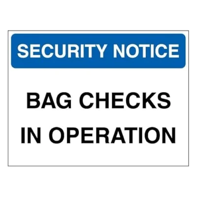 V Safety Security Notice Bag Checks In Operation Blue 400 x 300 mm Self Adhesive Vinyl Sign