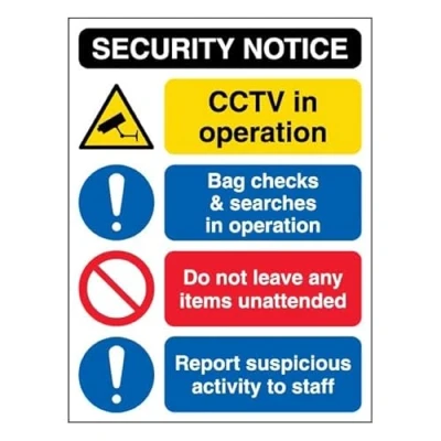 V Safety Security Notice CCTV/Bag Checks & Searches/Unattended Items 300 x 400 mm Self Adhesive Vinyl Sign