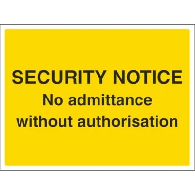Helps to fulfil legal obligations to inform employees, visitors and the general public of potential hazards as per Health and Safety (Safety Signs & Signals) Regulations 1996 Conforms to EN ISO 7010:2012 - Warning signs feature a triangular symbol with a black pictogram and yellow background occupying at least 50% of the total sign area Landscape Orientation. Sign reads "Security Notice. No Admittance Without Authorisation" Highly durable 1mm plastic material and screen printed message will stand the test of time Sign measures 400 x 300mm