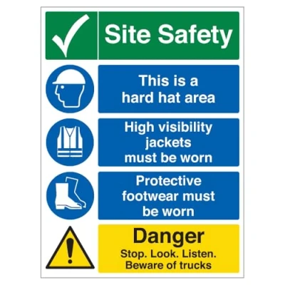 Instructions on high-visibility clothing, hard hats, and protective footwear are mandatory in this area to ensure safety and compliance with site regulations. Lightweight and easy to transport, these signs are perfect for construction sites and other temporary safety needs. Weather and impact-resistant, making them ideal for both indoor and outdoor environments. Easy to clean and reuse, thanks to the wipeable surface that keeps them looking fresh. Fully recyclable and cost-effective, providing an eco-friendly and budget-friendly solution for temporary signage.
