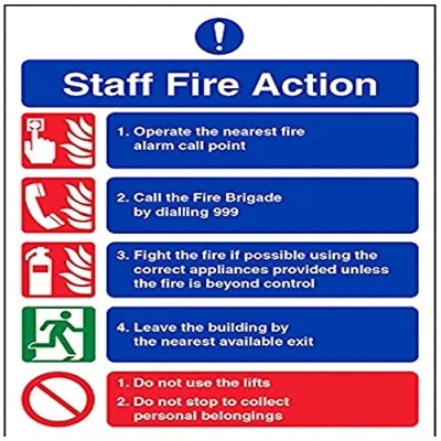 Provides essential information regarding action to be taken in the event of a fire Conforms to EN ISO 7010:2012 Portrait Orientation. Sign reads "Staff Fire Action. Operate The Nearest Fire Alarm Call Point. Call The Fire Brigade By Dialling 999. Fight The Fire If Possible" Highly durable 1mm plastic material and screen printed message will stand the test of time Sign measures 150 x 200mm