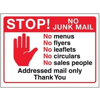 V Safety Stop Hand: No Junk Mail, Addressed Mail Only Sign 150mm x 100mm Self Adhesive Vinyl
