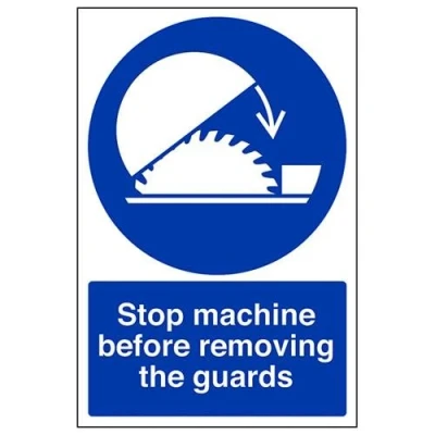 Helps to fulfil legal obligations to advise employees and visitors of specific actions and behaviour which must be adhered to in order to ensure personal safety as per Health and Safety (Safety Signs & Signals) Regulations 1996 Conforms to EN ISO 7010:2012 - Mandatory Signs feature a round symbol with a blue background of at least 50% of the total sign area, with a white pictogram and text Portrait Orientation. Sign reads "Stop Machine Before Removing The Guards" Highly durable 1mm plastic material and screen printed message will stand the test of time Sign measures 200 x 300mm