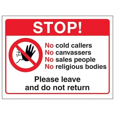 V Safety Stop! No Cold Callers, No...Please Leave and Do Not Return 200 x 150 mm 2mm Rigid Plastic Sign