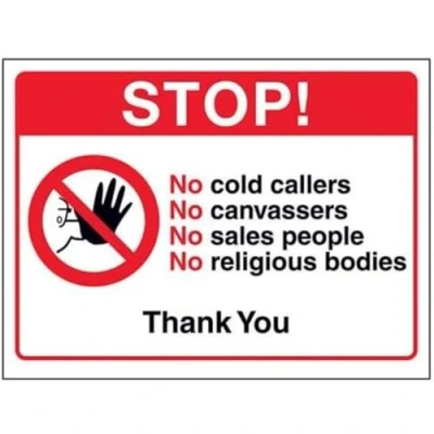 V Safety Stop! No Cold Callers Or Sales People Sign 150mm x 100mm Self Adhesive Vinyl