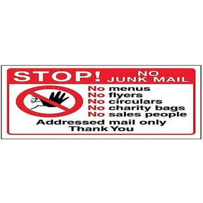 V Safety Stop: No Junk Mail, Addressed Thank You Sign 200mm x 150mm Self Adhesive Vinyl