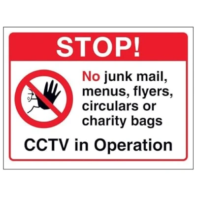 V Safety Stop! No Junk Mail, Menus, Flyers...CCTV in Operation 150 x 100 mm 3mm Brushed Aluminium Composite Sign