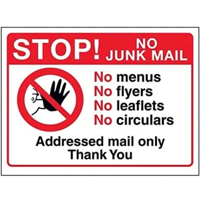V Safety Stop: No Junk Mail Sign 150mm x 100mm Self Adhesive Vinyl