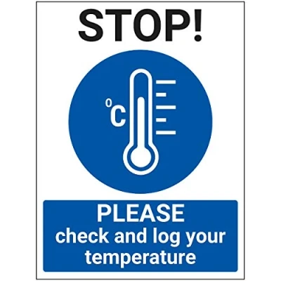 V Safety STOP Please Check And Log Your Temp 300mm x 400mm Self Adhesive Vinyl