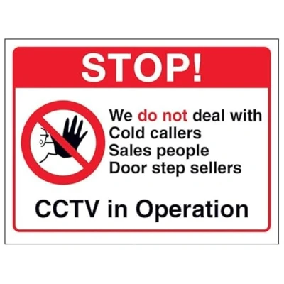 V Safety Stop! We Do Not Deal With Cold Callers...CCTV in Operation 150 x 100 mm 3mm Aluminium Composite Sign