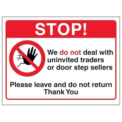 V Safety Stop! We Do Not Deal With Uninvited Traders Or Door Step Sellers... 150 x 100 mm Self Adhesive Vinyl Aluminium Effect Sign
