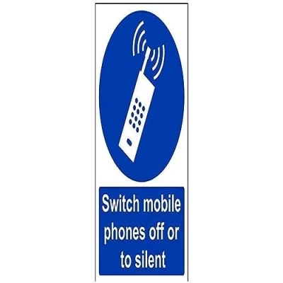 Helps to fulfil legal obligations to advise employees and visitors of specific actions and behaviour which must be adhered to in order to ensure personal safety as per Health and Safety (Safety Signs & Signals) Regulations 1996 Conforms to EN ISO 7010:2012 - Mandatory Signs feature a round symbol with a blue background of at least 50% of the total sign area, with a white pictogram and text Portrait Orientation. Sign reads "Switch Mobile Phones Off or To Silent" Highly durable Self Adhesive Vinyl material and screen printed message will stand the test of time Sign measures 200 x 300mm. Self Adhesive material will adhere securely to most surfaces