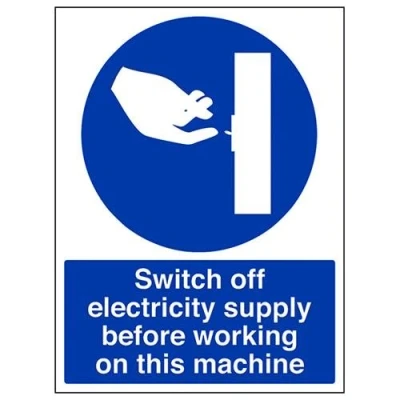 Helps to fulfil legal obligations to advise employees and visitors of specific actions and behaviour which must be adhered to in order to ensure personal safety as per Health and Safety (Safety Signs & Signals) Regulations 1996 Conforms to EN ISO 7010:2012 - Mandatory Signs feature a round symbol with a blue background of at least 50% of the total sign area, with a white pictogram and text Portrait Orientation. Sign reads "Switch Off Electricity Supply Before Working On This Machine" Highly durable 1mm plastic material and screen printed message will stand the test of time Sign measures 300 x 400mm