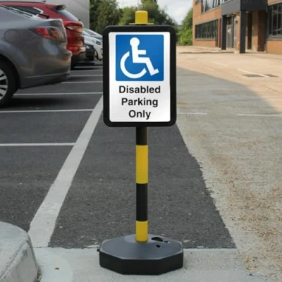 Wording & Purpose - Sign reads "Temporary Signpost - Disabled Parking Only"; designed to clearly communicate essential site information. Material & Build - 3 mm aluminium composite (ACM) that is lightweight, rigid, weatherproof and resistant to rust and corrosion; retro-reflective finish that enhances night-time and long-range visibility in low-light conditions. Visibility & Legibility – Retro‑reflective finish improves night‑time visibility and long‑range detection under headlights and low‑light conditions. Compliance by Design – Manufactured to follow UK/EU safety-sign rules, using the correct EN ISO 7010 pictograms, shapes and colour coding, with layouts aligned to HSE Safety Signs & Signals Regulations (1996) and BS 5499 legibility principles for clear, consistent communication. Made in Britain – Manufactured in Britain using premium materials for dependable quality, durable finishes and fast turnaround; engineered for high‑traffic commercial settings.