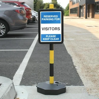 Wording & Purpose - Sign reads "Temporary Signpost - Reserved Parking For Visitors Please Keep Clear"; designed to prevent blockages around critical routes or equipment. Material & Build - 3 mm aluminium composite (ACM) that is lightweight, rigid, weatherproof and resistant to rust and corrosion; retro-reflective finish that enhances night-time and long-range visibility in low-light conditions. Visibility & Legibility – High‑contrast colours and standard symbols maximise readability; lightweight build supports easy placement and a consistent professional look across your site. Compliance by Design – Manufactured to follow UK/EU safety-sign rules, using the correct EN ISO 7010 pictograms, shapes and colour coding, with layouts aligned to HSE Safety Signs & Signals Regulations (1996) and BS 5499 legibility principles for clear, consistent communication. Made in Britain – Manufactured in Britain using premium materials for dependable quality, durable finishes and fast turnaround; engineered for high‑traffic commercial settings.
