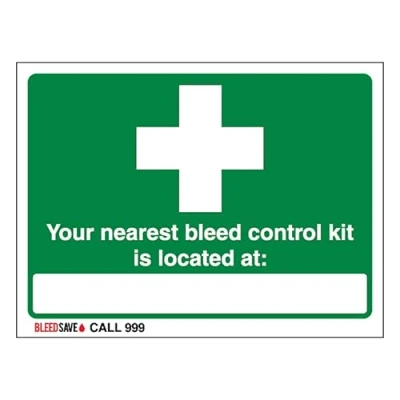 V Safety The Nearest Bleed Control Kit Is Located Call 999 200 x 150 mm Glow In Dark 1mm Rigid Plastic Sign