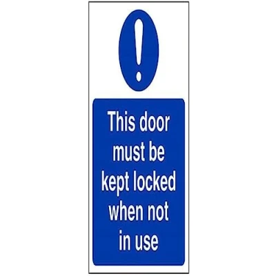 Helps to fulfil obligations to show vital escape route information about fire doors for all employees and visitors as per Health and Safety (Safety Signs & Signals) Regulations 1996 Conforms to EN ISO 7010:2012 Portrait Orientation. Sign reads "This Door Must Be Kept Locked When Not In Use" Highly durable 1mm plastic material and screen printed message will stand the test of time Sign measures 150 x 200mm