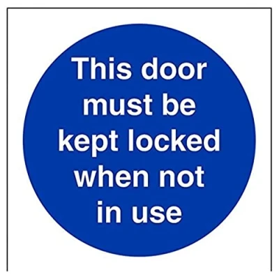 Helps to fulfil obligations to show vital escape route information about fire doors for all employees and visitors as per Health and Safety (Safety Signs & Signals) Regulations 1996 Conforms to EN ISO 7010:2012 Square Orientation. Sign reads "This Door Must Be Kept Locked When Not In Use" Highly durable 1mm plastic material and screen printed message will stand the test of time Sign measures 100 x 100mm