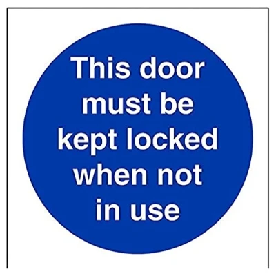 Helps to fulfil obligations to show vital escape route information about fire doors for all employees and visitors as per Health and Safety (Safety Signs & Signals) Regulations 1996 Conforms to EN ISO 7010:2012 Square Orientation. Sign reads "This Door Must Be Kept Locked When Not In Use" Highly durable Self Adhesive Vinyl material and screen printed message will stand the test of time Sign measures 100 x 100mm. Self Adhesive material will adhere securely to most surfaces