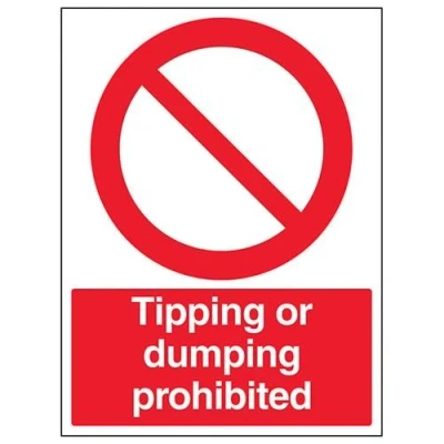 Clearly displays prohibited and potentially dangerous actions which employees and visitors must avoid in the interests of health and safety as per Health and Safety (Safety Signs & Signals) Regulations 1996 Conforms to EN ISO 7010:2012 - Prohibition signs feature a red circular symbol of at least 35% of the total sign area, on a white background, with a black pictogram Portrait Orientation. Sign reads "Tipping or Dumping Prohibited" Highly durable 1mm plastic material and screen printed message will stand the test of time Sign measures 300 x 400mm
