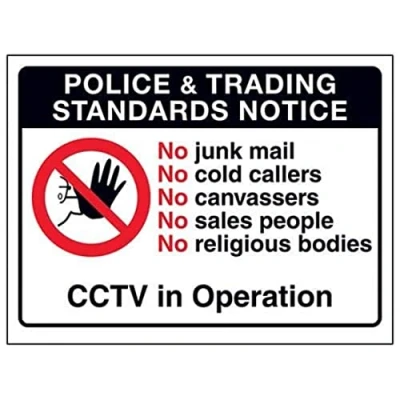 V Safety Trading Standards: No Cold Callers CCTV in Use Sign 200mm x 150mm Self Adhesive Vinyl